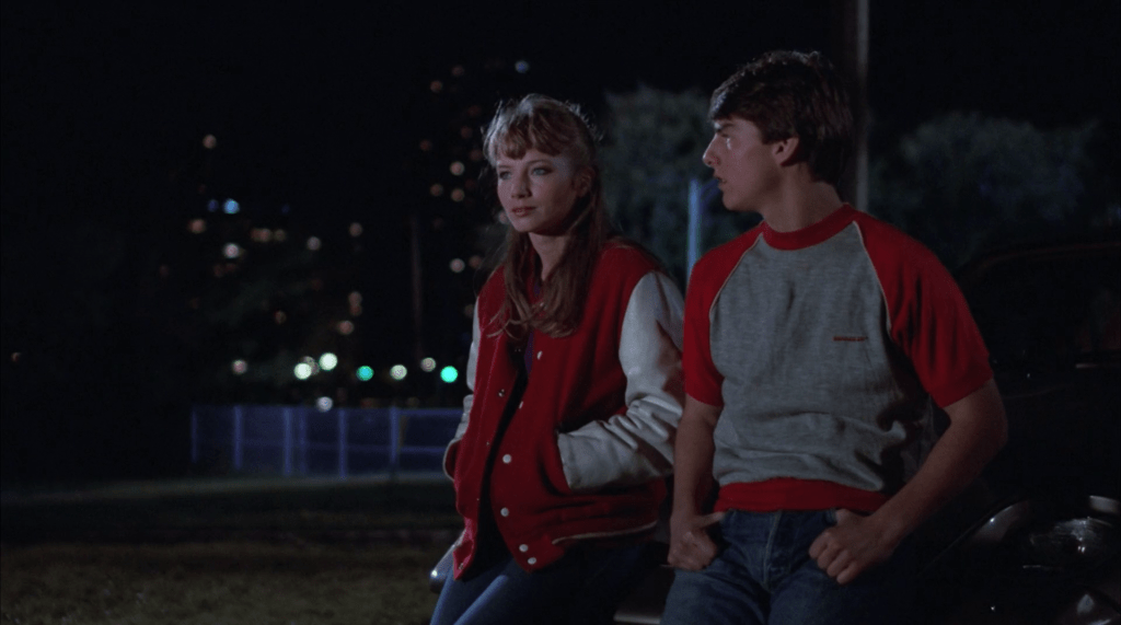 Tom Cruise’s breakout turn as Joel is among the most true-to-life depiction of college teendom in its tumult of strivings & concerns: he’s got bright eyes, but they’re nervously wide. Joel’s an amicable guy with a lot of healthy masculine energy to let out when dancing around in his undies to Bod Seger tunes when the house is to himself or laughing with some raunchy stories while playing poker with friends. But he doesn’t feel safe honestly exuding his personality around most people for fear of being stuck by socially crippling judgment from authorities. As a business student from a fairly well-off family, he isn’t high-class enough to be immune from scandal, just enough so that any blunder would be somewhat of a social spectacle.